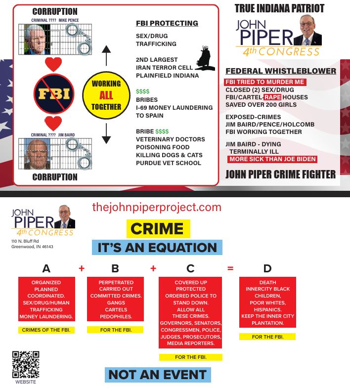 John Piper's 30 Second TV Spot Watch the video below:V.P. PENCE & FBI ARE HUMAN TRAFFICKERS / TIMELINE & EVIDENCE Click Icon to Download PDFCOVER UP BY U.S. ATTORNEYS OFFICE! Click Icon to Download PDF The John Piper Project - PLATFORM OF...